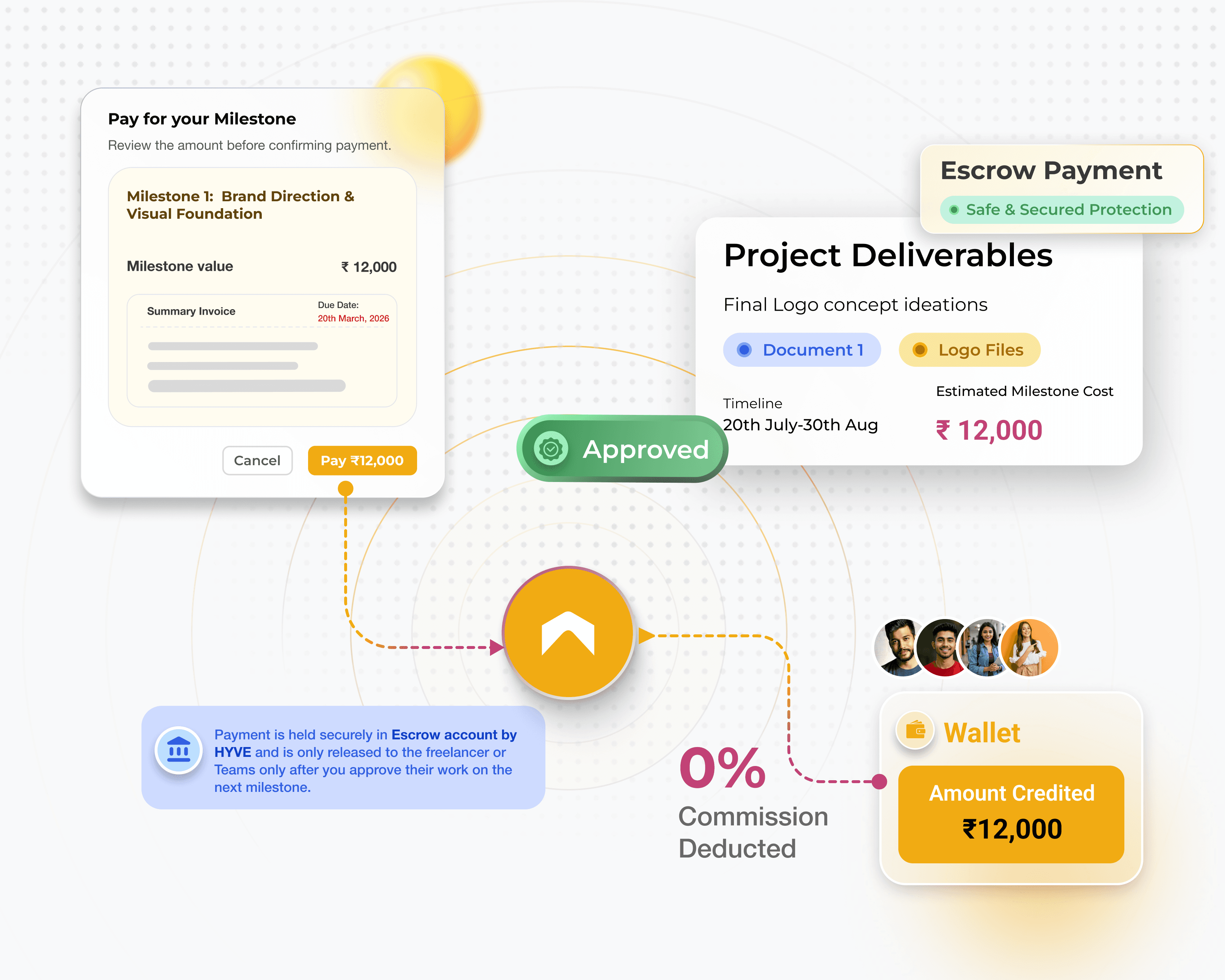 Milestone-based escrow ensures payments are released only after approved work, protecting both sides.