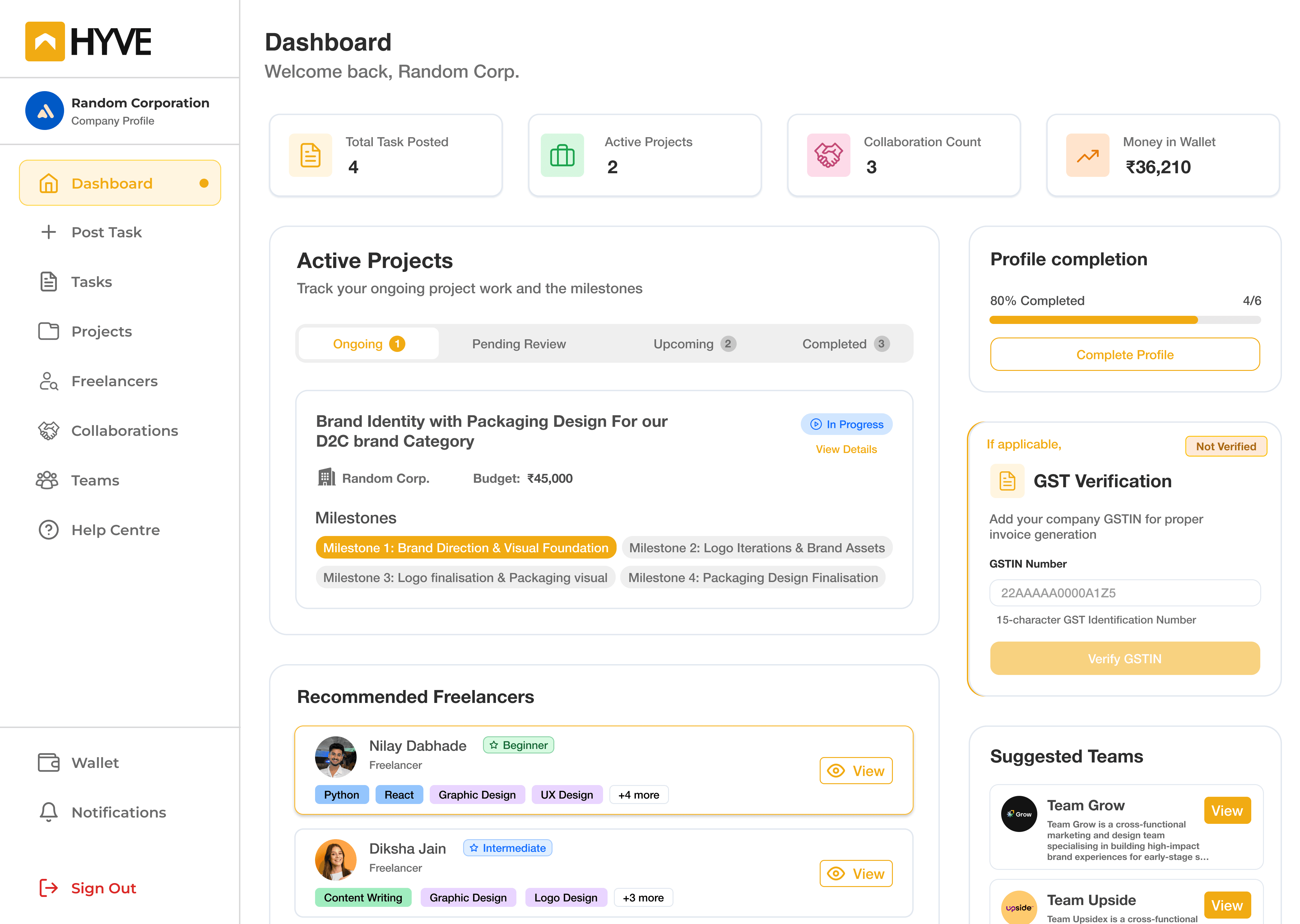 HYVE is designed for freelancers, freelance teams, startups, and companies looking to collaborate on meaningful projects.